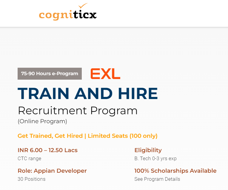 Cogniticx & EXL Services Pvt Ltd. in partnership with the Office of the Principal Scientific Adviser to the Government of India has announced Mobilize, Train and Hire programs for EXL Service (India) Pvt. Ltd. - Program to mobilize B-Tech talent (both pursuing students and graduates) and train the Talent in practical applications of Digital and Data Science technologies towards solving Industry problems and promote their employability and competitiveness.