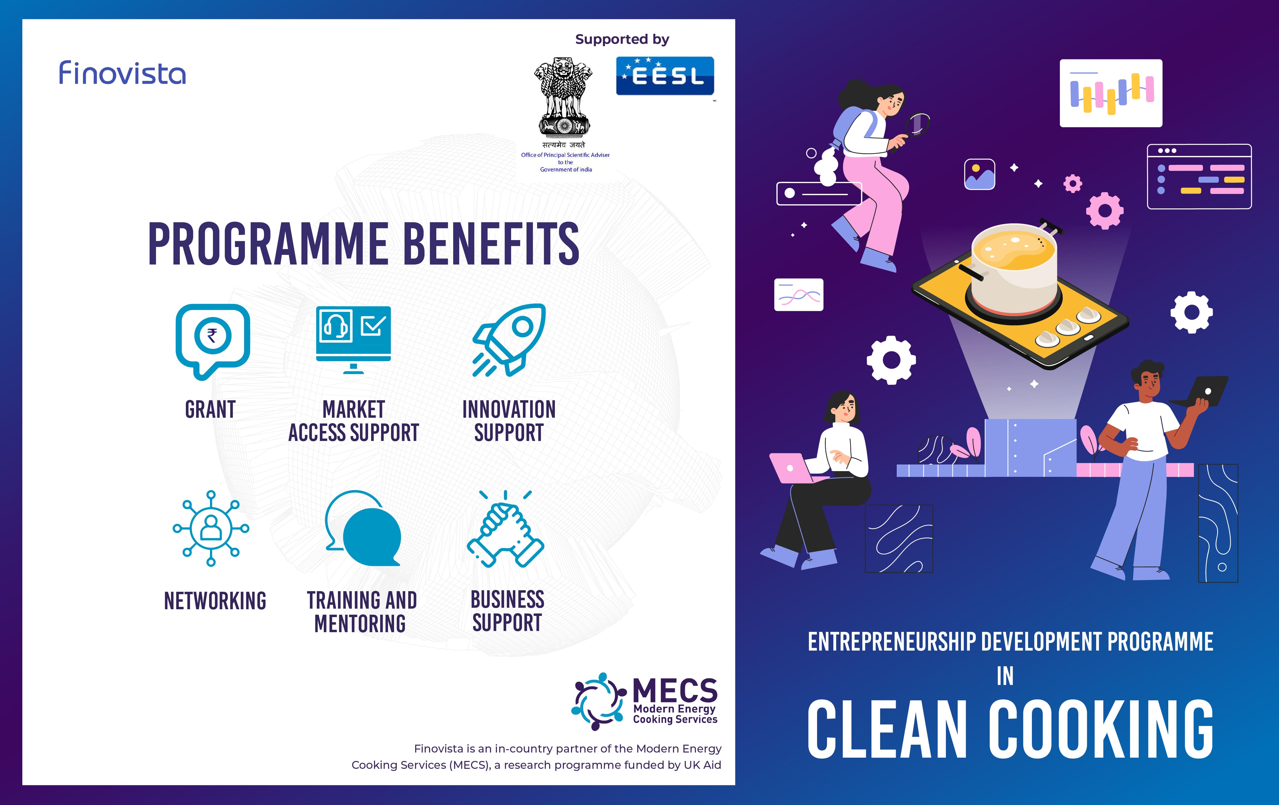 Modern Energy Cooking Services (MECS) Program, India in partnership with Office of the Principal Scientific Adviser to the Government of India and Energy Efficiency Services Limited (EESL) through its in-country program partner in India – Finovista is organizing Entrepreneurship Development Program in Clean Cooking.