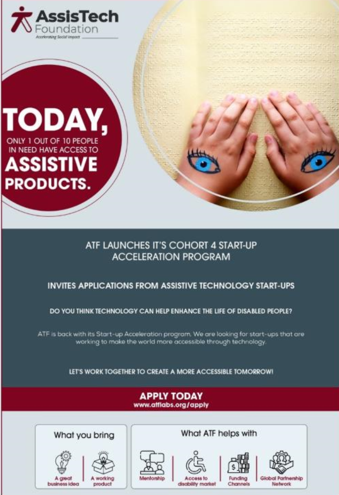 AssisTech Foundation (ATF) is inviting applications from assistive technology startups for their Cohort 4 Acceleration program. ATF has enabled many start-ups to turn their ideas into products that transform the lives of many in need. If selected for this program, the start-up will have access to funding channels, Mentorship, disability market, ATF’s global AT partners in 7 countries, enabling services and networking. All Start-ups working in the space of assistive technologies are welcome to apply.