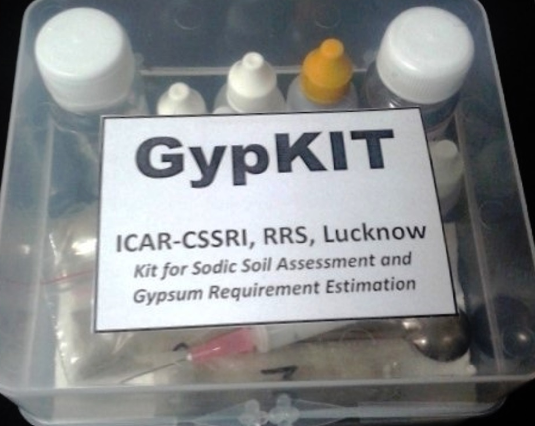 GypKit is a farmer-friendly field kit designed for rapid assessment of soil sodicity and estimation of gypsum requirement to reclaim sodic soils. By determining gypsum needs before chemical reclamation, it prevents over- or under-application of amendments, ensuring effective soil management. The kit is portable and can be conveniently used on farms.