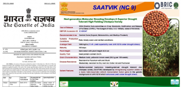 SAATVIK is an improved desi chickpea variety developed by introgressing a superior drought-tolerance allele of a basic helix-loop-helix gene from a landrace into the popular JAKI 9218 variety. It delivers 15% higher yield under drought stress by modulating ABA signalling and enhancing photosynthetic efficiency.